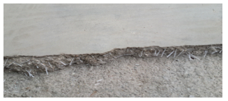 ↑탬핑 기계미장 마감 후 파쇄한 단면 - 표면에서 일정 깊이 이하로 섬유가 위치함.